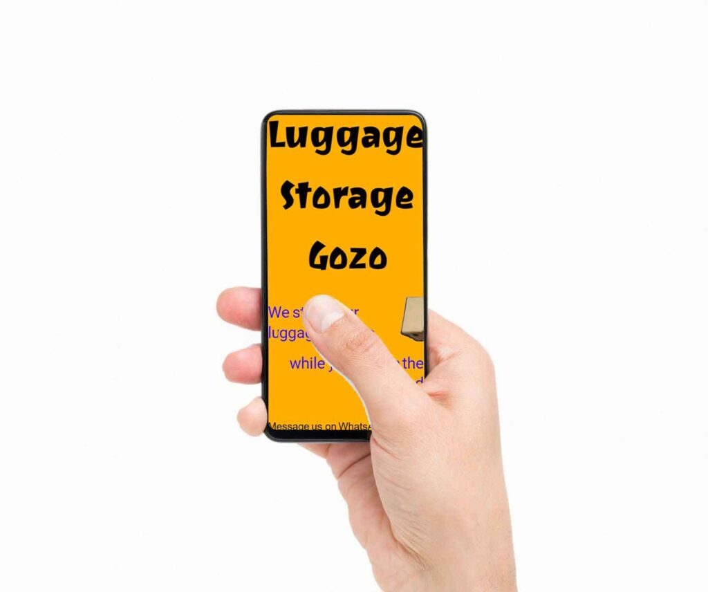 Luggage Storage Gozo We store your luggage in Gozo while you explore the island Message us on WhatsApp prior to your arrival!!! No struggle to carry No beach stealing No theft from car Store your luggage with us and enjoy the day Luggage Type We accept all kinds of luggage, back packs, bags, and more Charge your smartphone / tablet / laptop while in store Charging @ 2€ per item Secure Storage Cheap Rates Simple Process Location Follow our pin “Luggage Storage Gozo” on google maps. We are close to Ramla Bay in Gozo.Find Il-Barrag Farmhouse B&B to deposit your luggage, bags, and tablets. Message us on WhatsApp Il-Barrag Farmhouse B&BSpend an unforgettable night in GozoA traditional bedroom in a 400 year old farmhouse, where animals used to shelter. Carefully restored with modern comodities.Let's See Luggage Transfer Are you far from our location? We can pick up your luggage from anywhere in Gozo, and deliver it back anywhere later on Rates - Prices are per item - Click on the image to pre-pay and reserve your storage - Cash payment when depositing your bags also accepted - Early reservation of your storage is recommended Message us on WhatsApp prior to your arrival!!!! Storage for Small Bag5€ Up to hand luggage size7€ Bigger than hand luggage10€ Offsite Collection12€ Offsite Delivery12€ Charging Option3€ Visiting Comino? Get your tickets when you drop your luggage with us, and skip the queue for the boat. Contact us for any difficulties +356 99256433 In Partnership with IL-BARRAG FARMHOUSE B&B